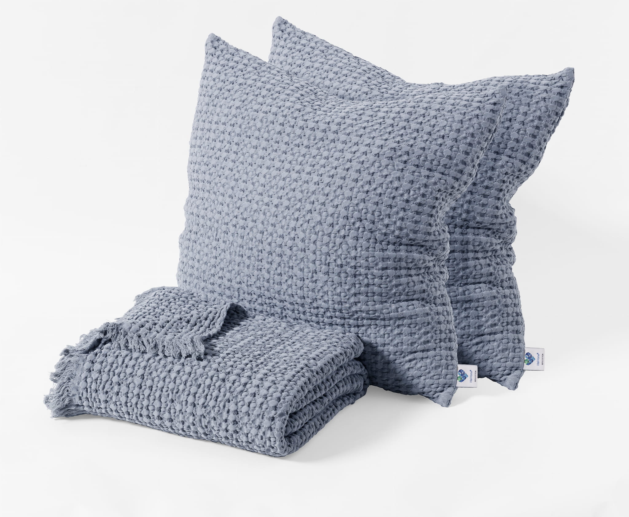 Oferta dotyczy jednej sztuki portugalskiej poszewki na poduszkę z kolekcji Favo Design, wykonanej z misternie utkanej bawełny o wzorze gofra w prezentowanym na zdjęciu kolorze: AZURE M30266